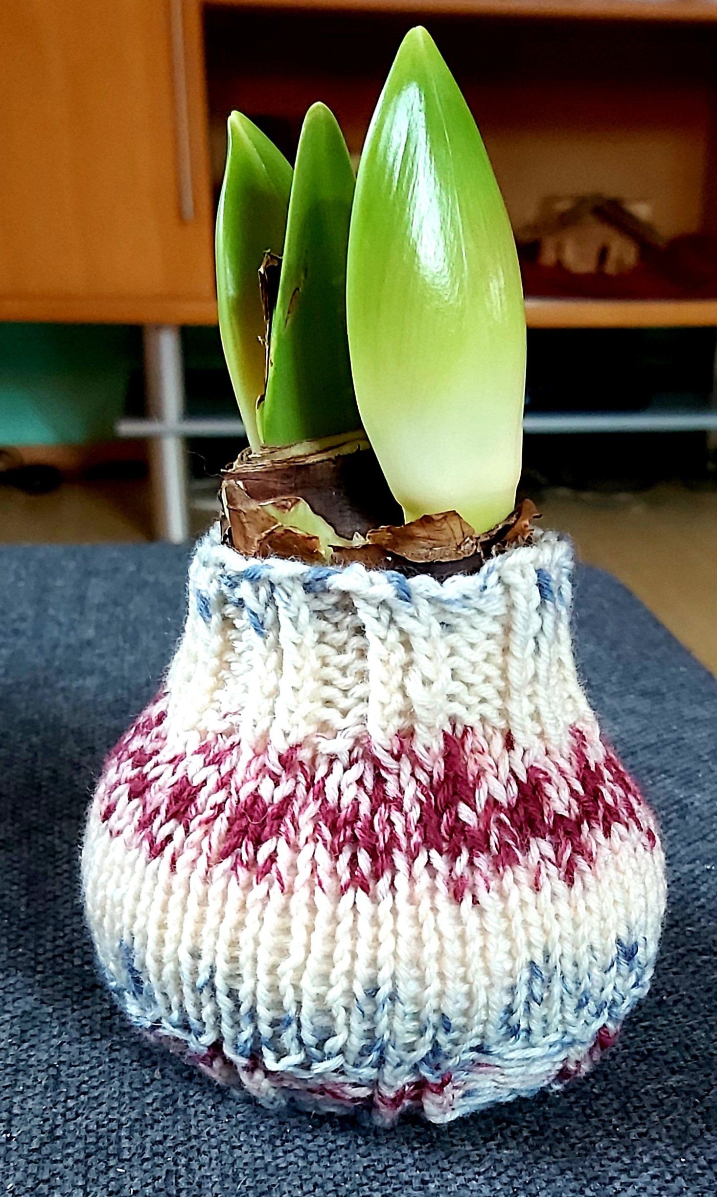 Ein nettes kleines Mitbringsel oder für sich selbst zuhause. Einfach eine Amaryllis im Wachsmantel umstricken.